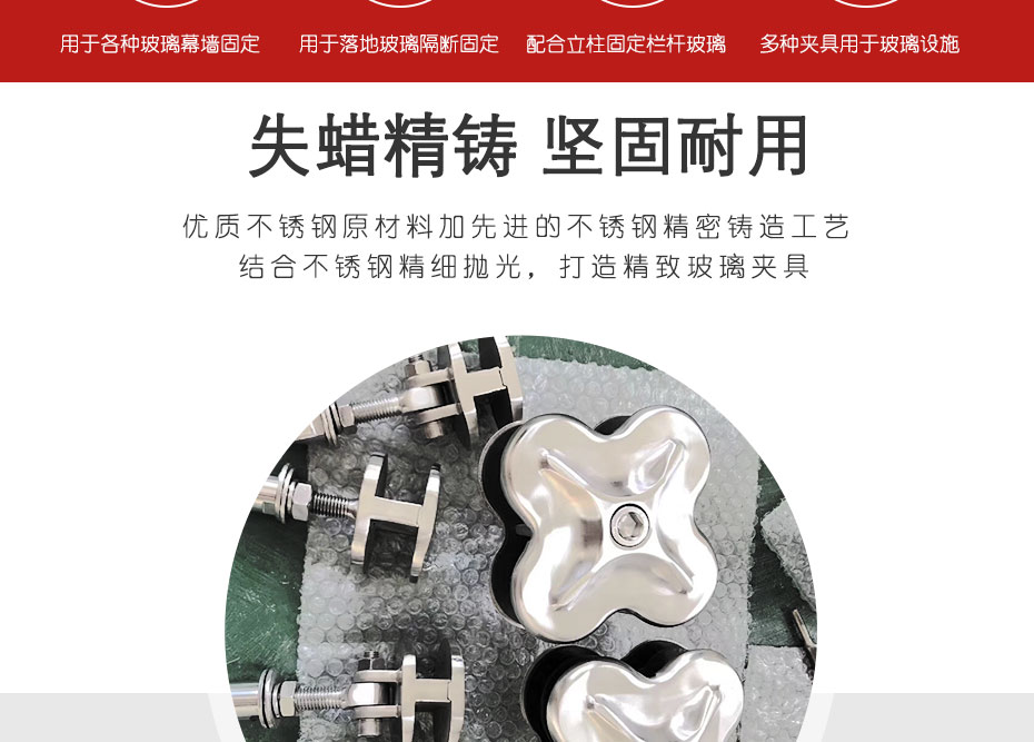 產品用途:用做(zuò)玻璃固定(dìng)使用,也可做玻璃支撐使用,可搭配爪件、立柱等產品使用。