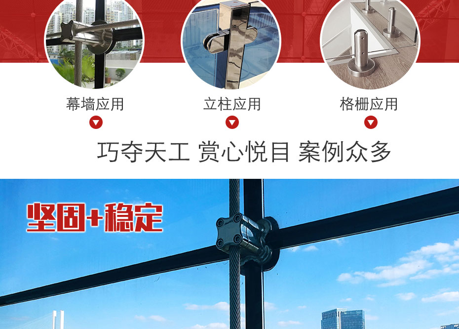 涵蓋不鏽鋼幕牆配件、玻璃夾具、欄杆扶手立(lì)柱等產品,多項質量檢驗(yàn)工序,為客戶量身定製解決方案,靈(líng)活應(yīng)對各種(zhǒng)定製需求。